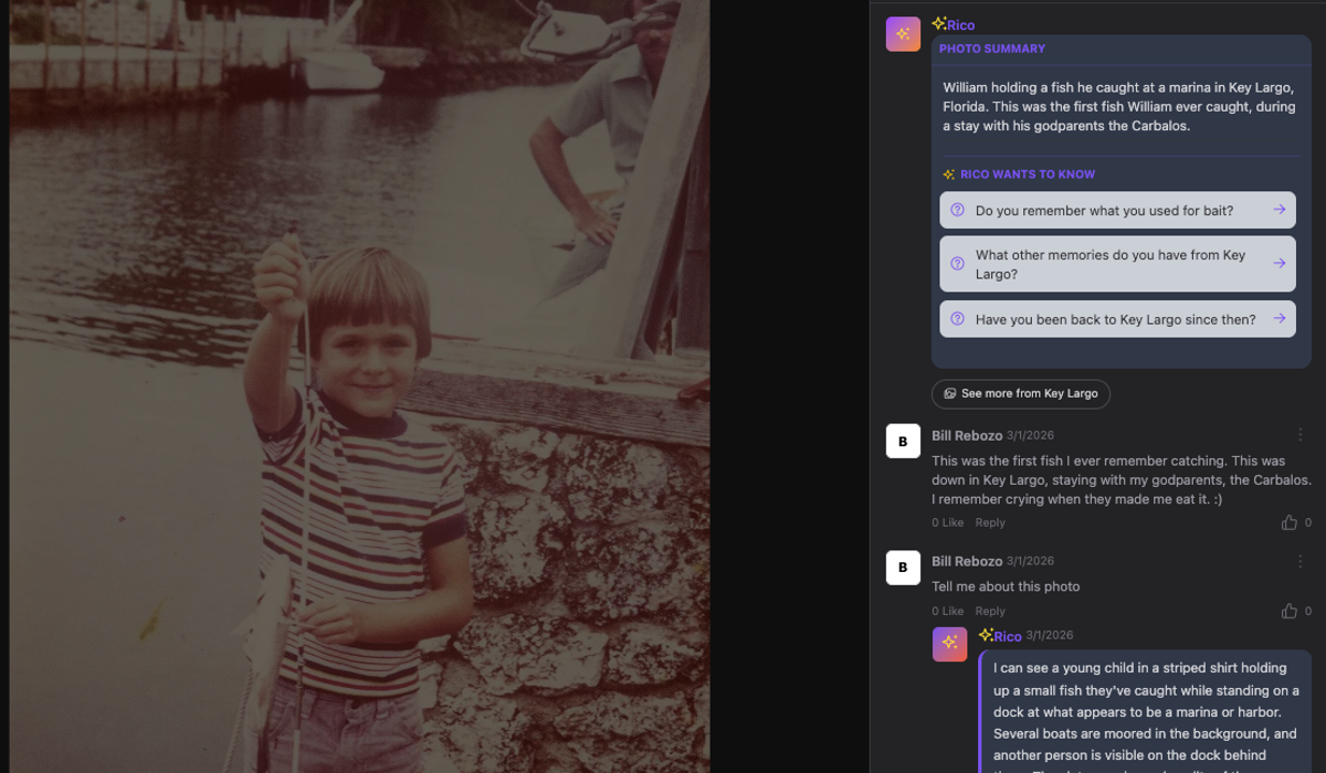 So instead of just seeing “a kid holding a fish,” Rico understands when and where the photo was taken, who the person is, how they’re connected to others, and details about the moment itself.